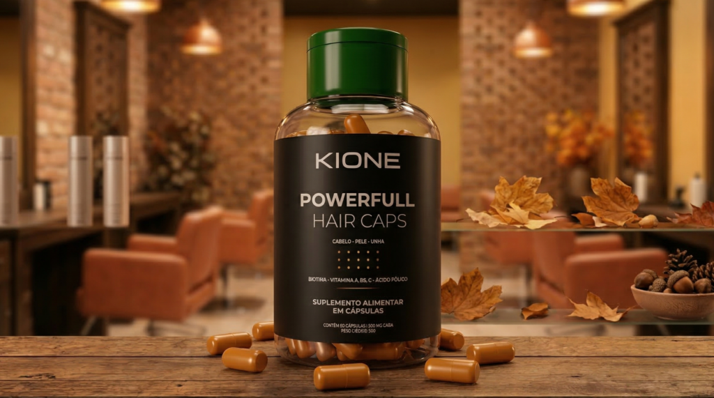 A verdadeira força capilar começa na sua nutrição diária — esta é a base do conceito “In”. Para complementar o tratamento externo, o Powerfull Hair Caps, da Kione Cosmetic, é o suplemento alimentar definitivo para blindar sua saúde capilar e as suas unhas de dentro para fora.